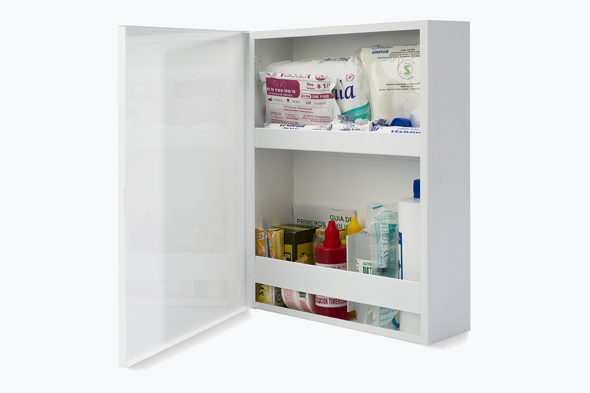 Botiquín de primeros auxilios modelo Regular Line 352 de 28 elementos hecho en chapa recubierto con pintura epoxi. – MEDIDAS: 356 x 274 x 82 mm